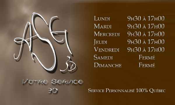Reproduction et Conception de ... infographie, documents publicitaire, logo, menu, papeterie, encart, cartes d'affaire, cartes de remerciement, affiche , étiquette, pochette etc. Impression grand format, kiosque, enseigne... Service personnalisé 100% Québec visitez le site internet asg3d.com